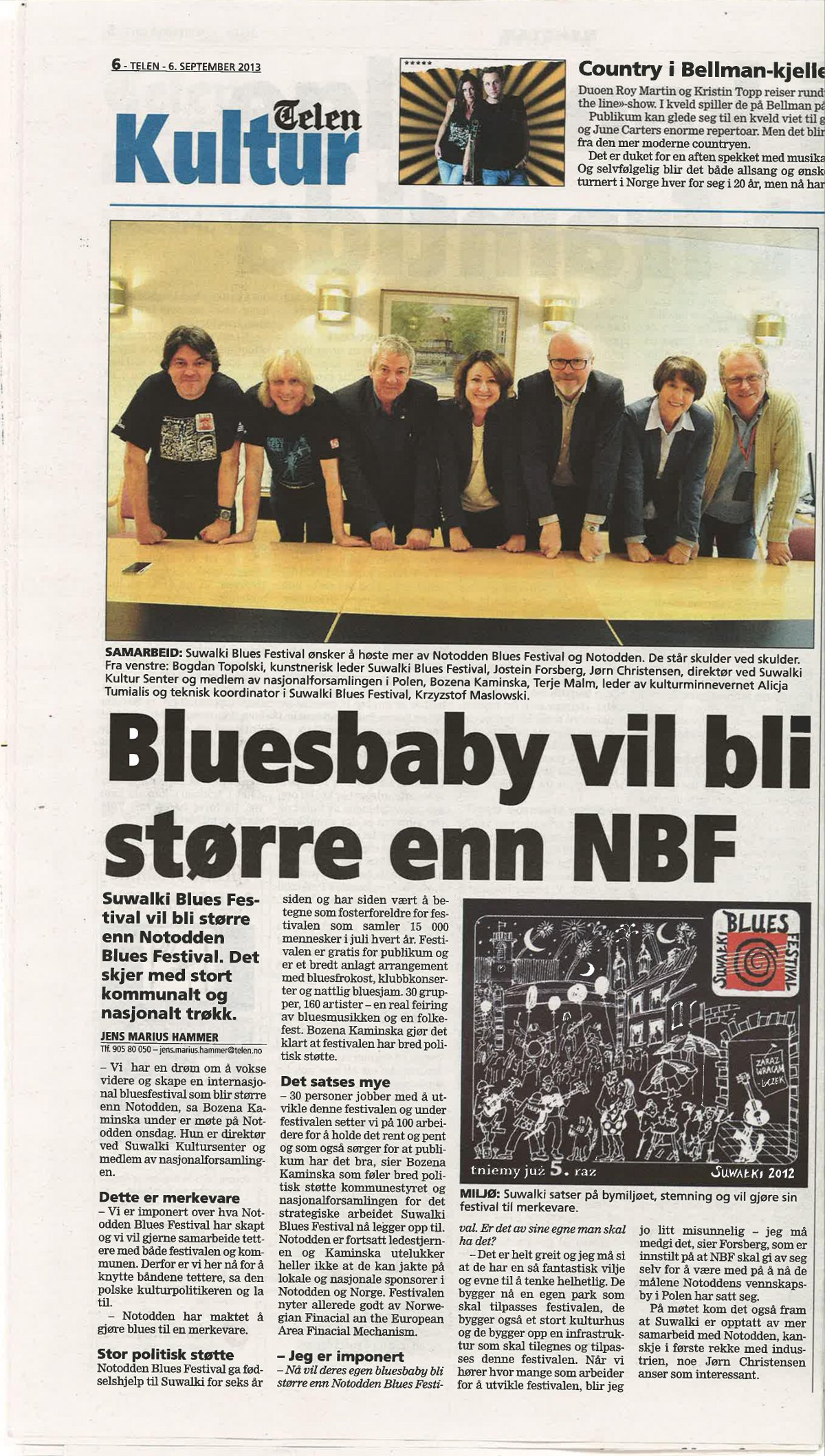 On September 3-5, 2013, the group managing the project “Promoting artistic and cultural diversity of the countries of north-eastern Europe and Scandinavia as part of the Suwałki Blues Festival 2013” visited Notodden as part of the visit summarizing the project. The main purpose of the visit was a working meeting on the evaluation of the project and further cooperation in the field of blues (cooperation of festivals and exchange of bands). The meeting was attended by: Bożena Kamińska – director of the Suwałki Cultural Center, director of the Suwałki Blues Festival 2013, Alicja Andrulewicz – Head of the Department of Culture and Monument Protection of the Municipal Office in Suwałki, Project Coordinator of the Suwałki Blues Festival 2013, Magdalena Tumialis – Promotion Department of the Suwałki Cultural Center, translator, Bogdan Topolski – Artistic Director of Suwałki Blues Festival, Krzysztof Masłowski – Technical Coordinator of Suwałki Blues Festival, Jorn Christensen – Mayor of Notodden, Jostein Forsberg – Director of Notodden Blues Festival, Terje Malm – Head of the Culture Department in Notodden, Bjorn Frode Moen – Advisor for International Affairs.