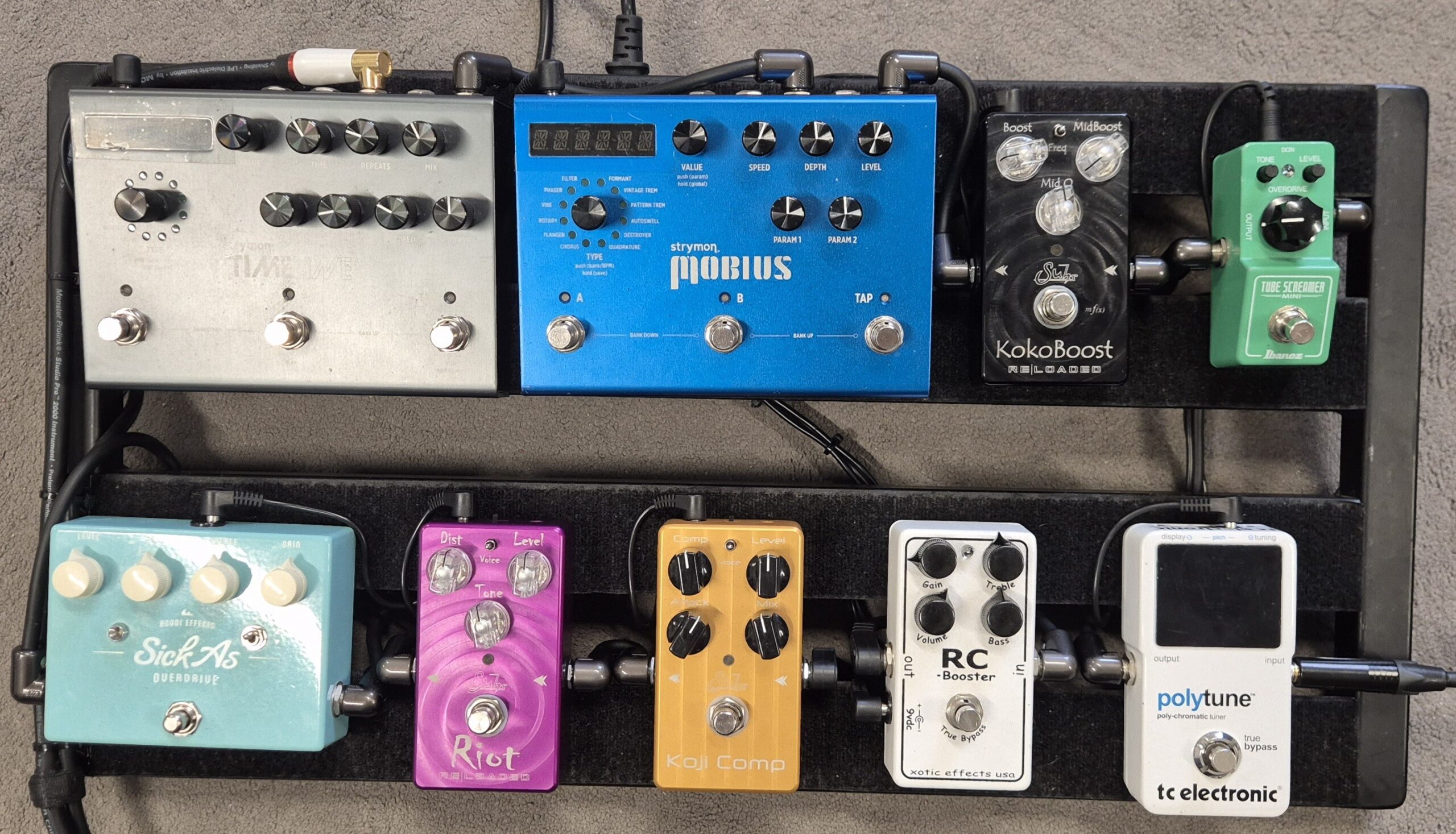 Strymon Timeline Strymon Mobius Suhr Koko Boost Reloaded Ibanez TS Mini Bondi Sick As Overdrive Suhr Riot Reloaded Suhr Koji Comp Xotic RC Booster Xotic RC Booster TC Electronic Polytune